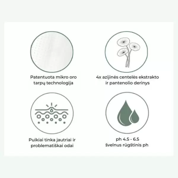 - Centella Asiatica (CICA) – padeda nuraminti odą ir sumažinti diskomforto pojūtį